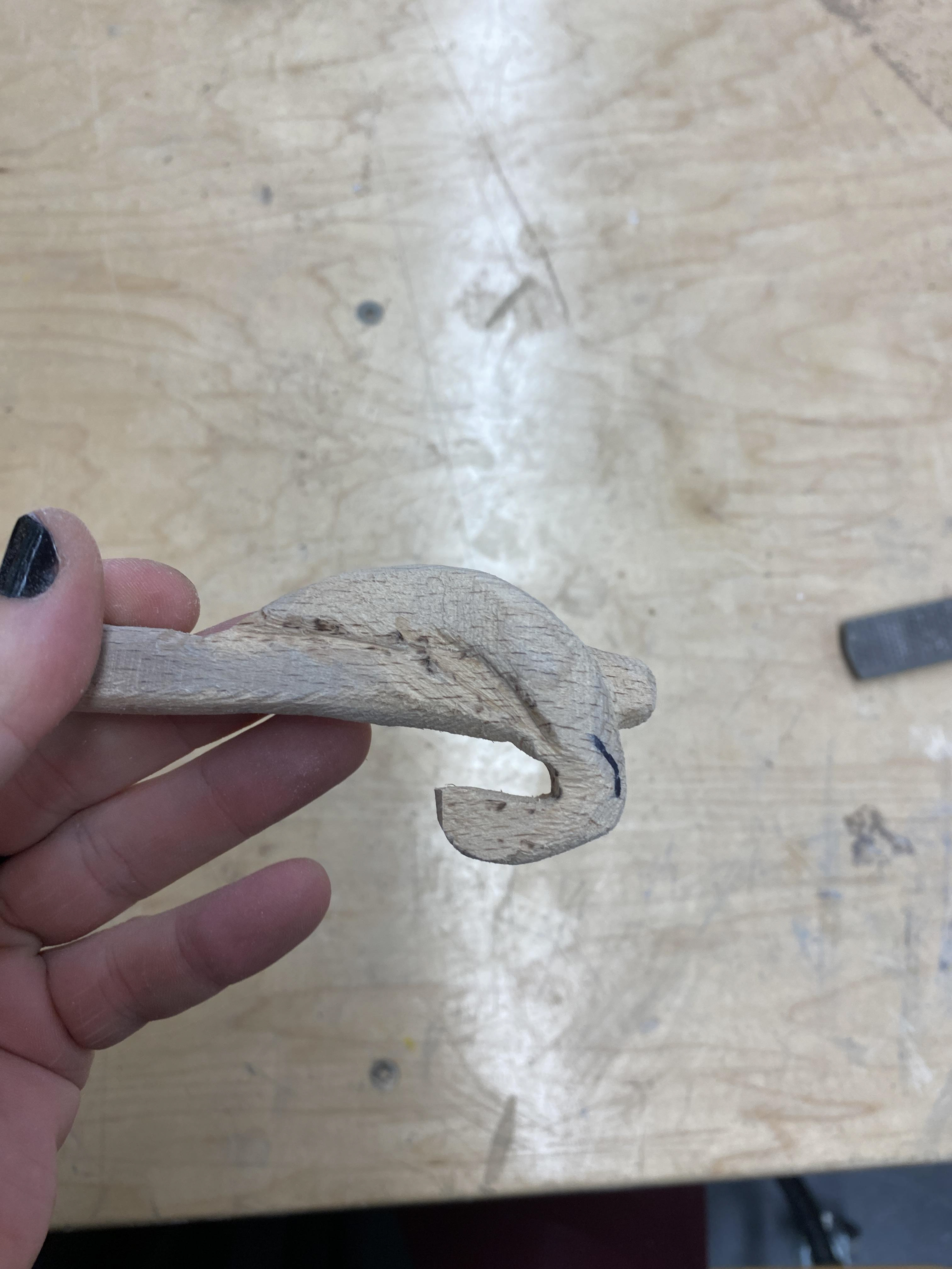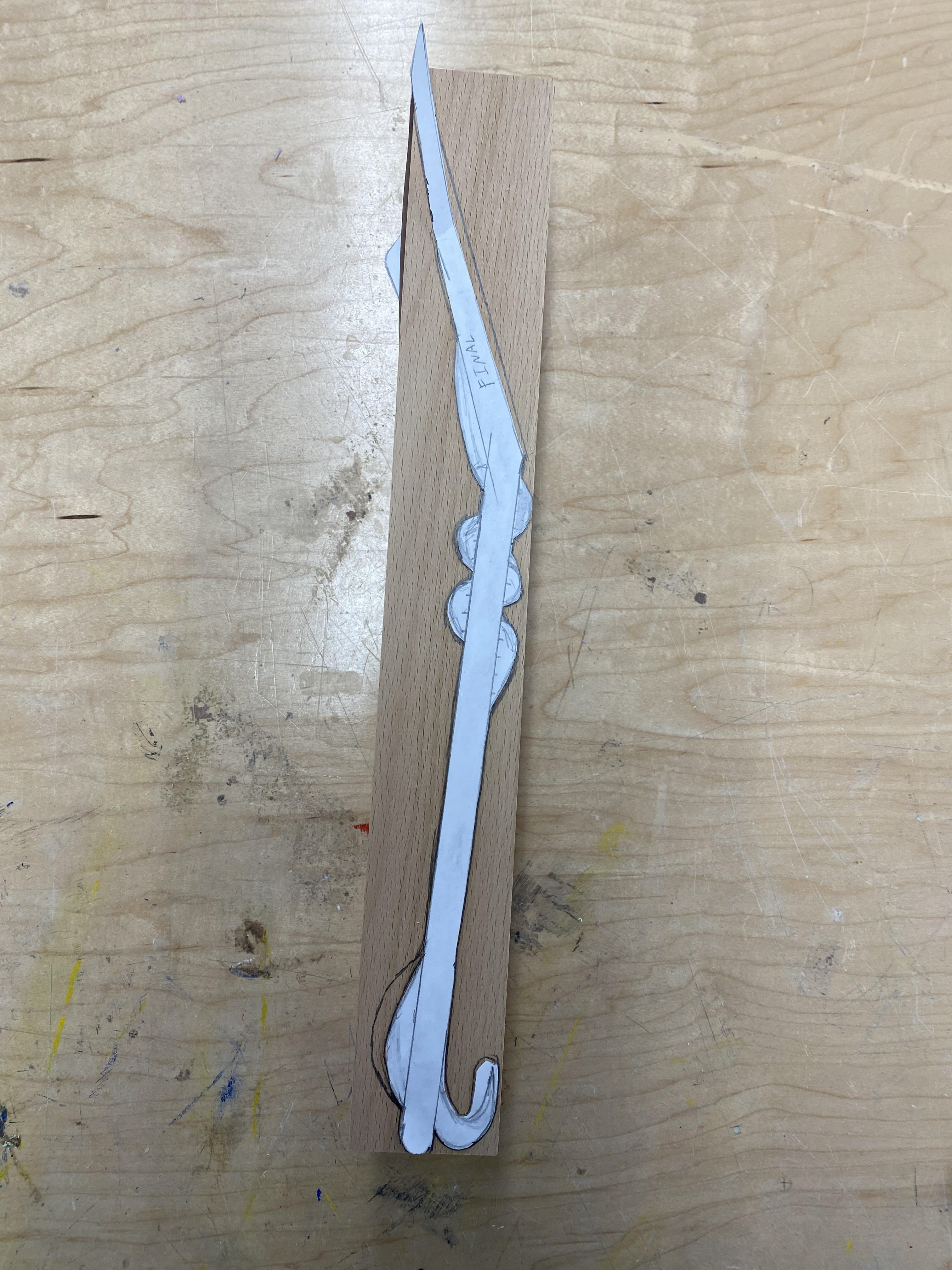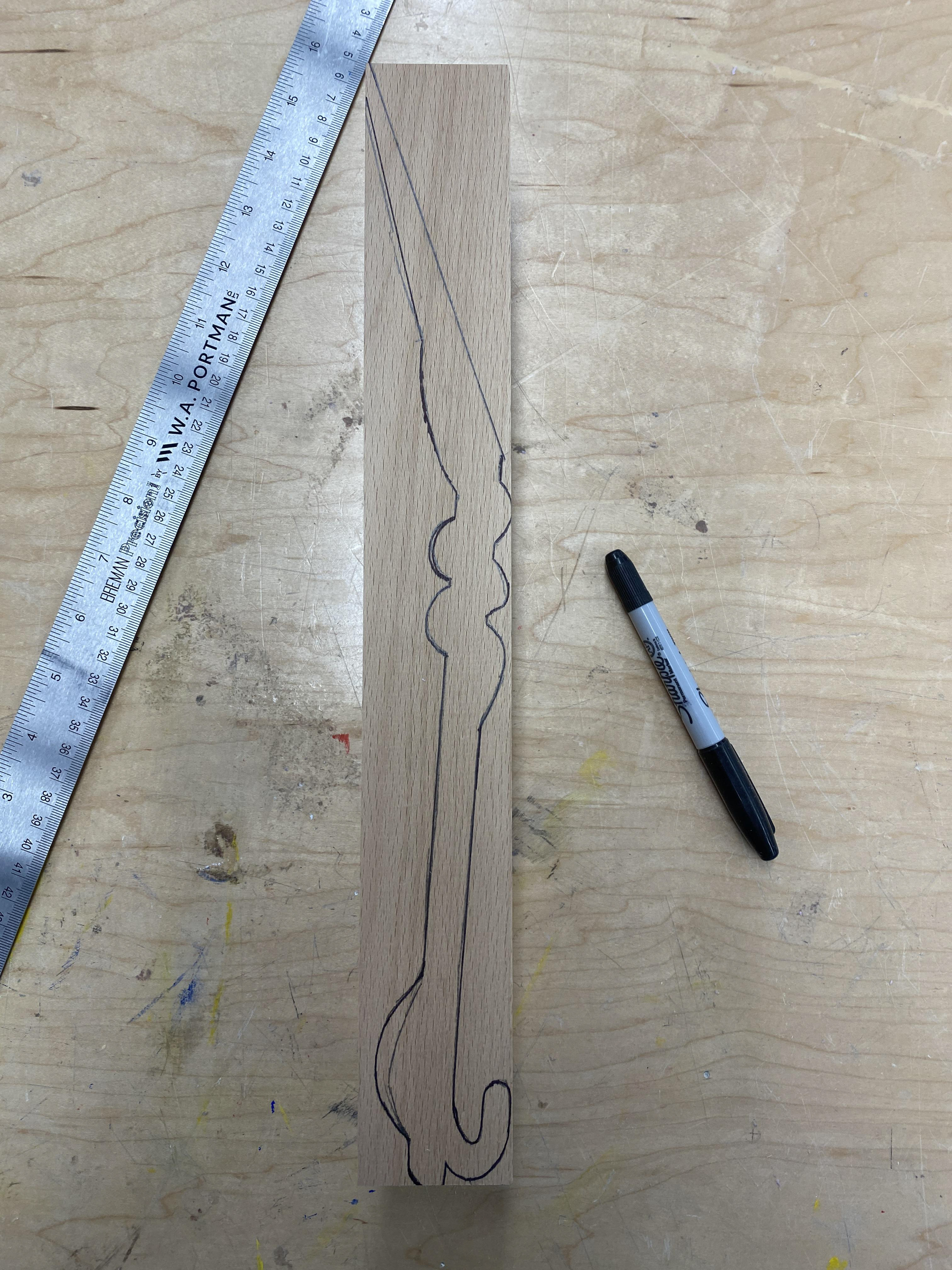 I did the same process on the wood (beech wood), using a traced pattern (it ended up being a little large in places for my wooden block, but I made it work), cut it out on a bandsaw, then used a rasp, wood carving tools, and sand paper to refine it to the shape I desired. Below you can see the step by step of my process.