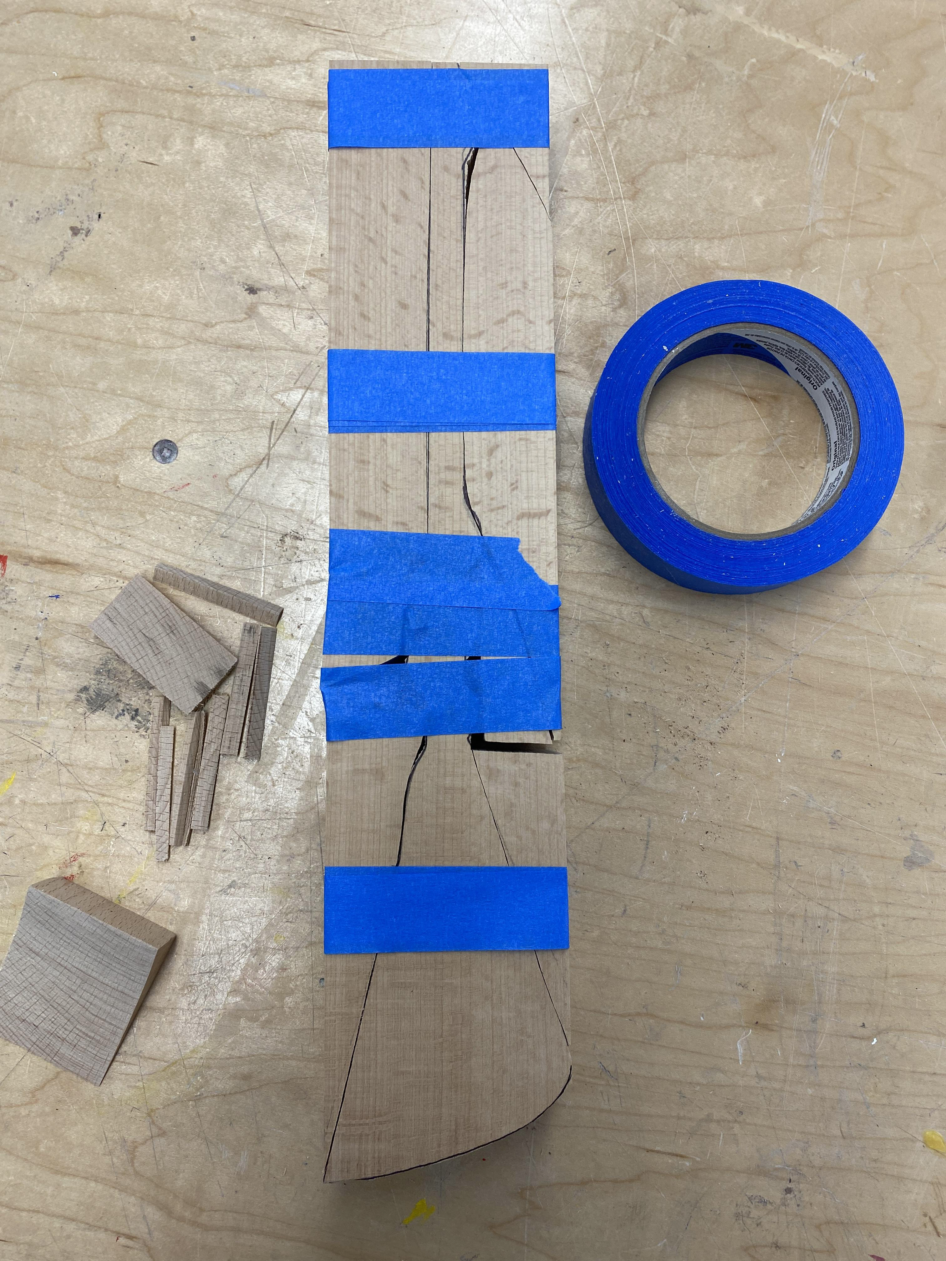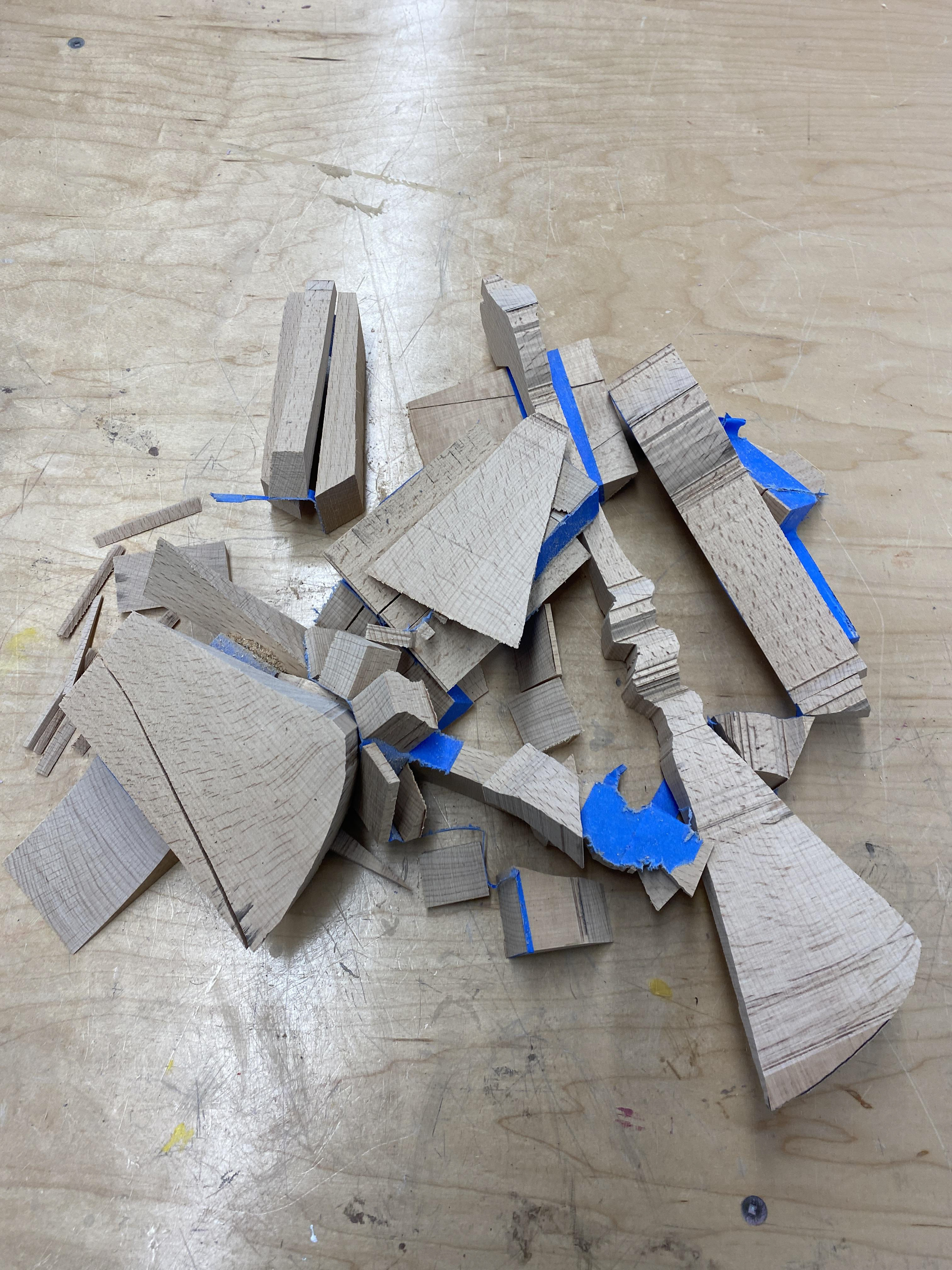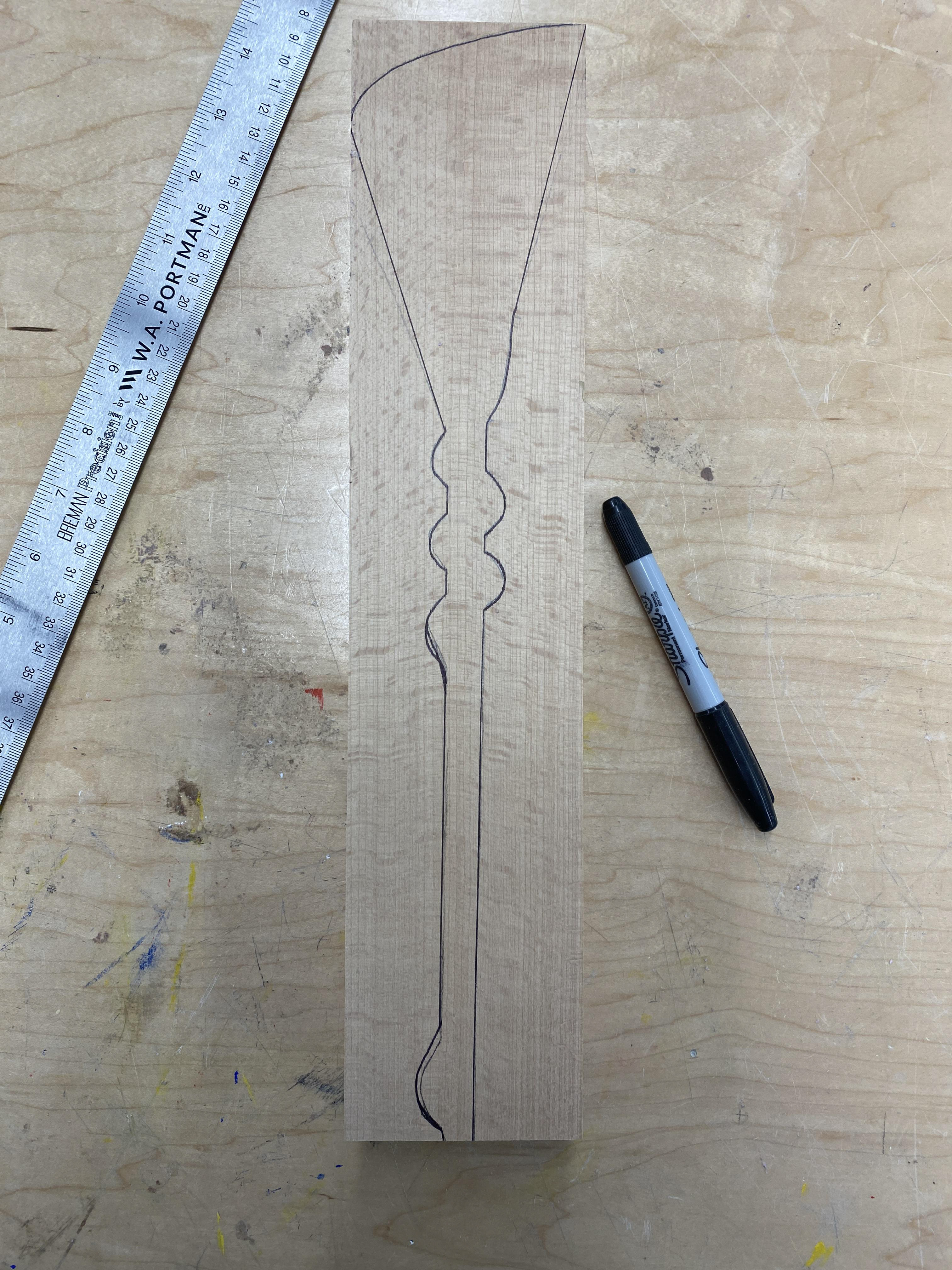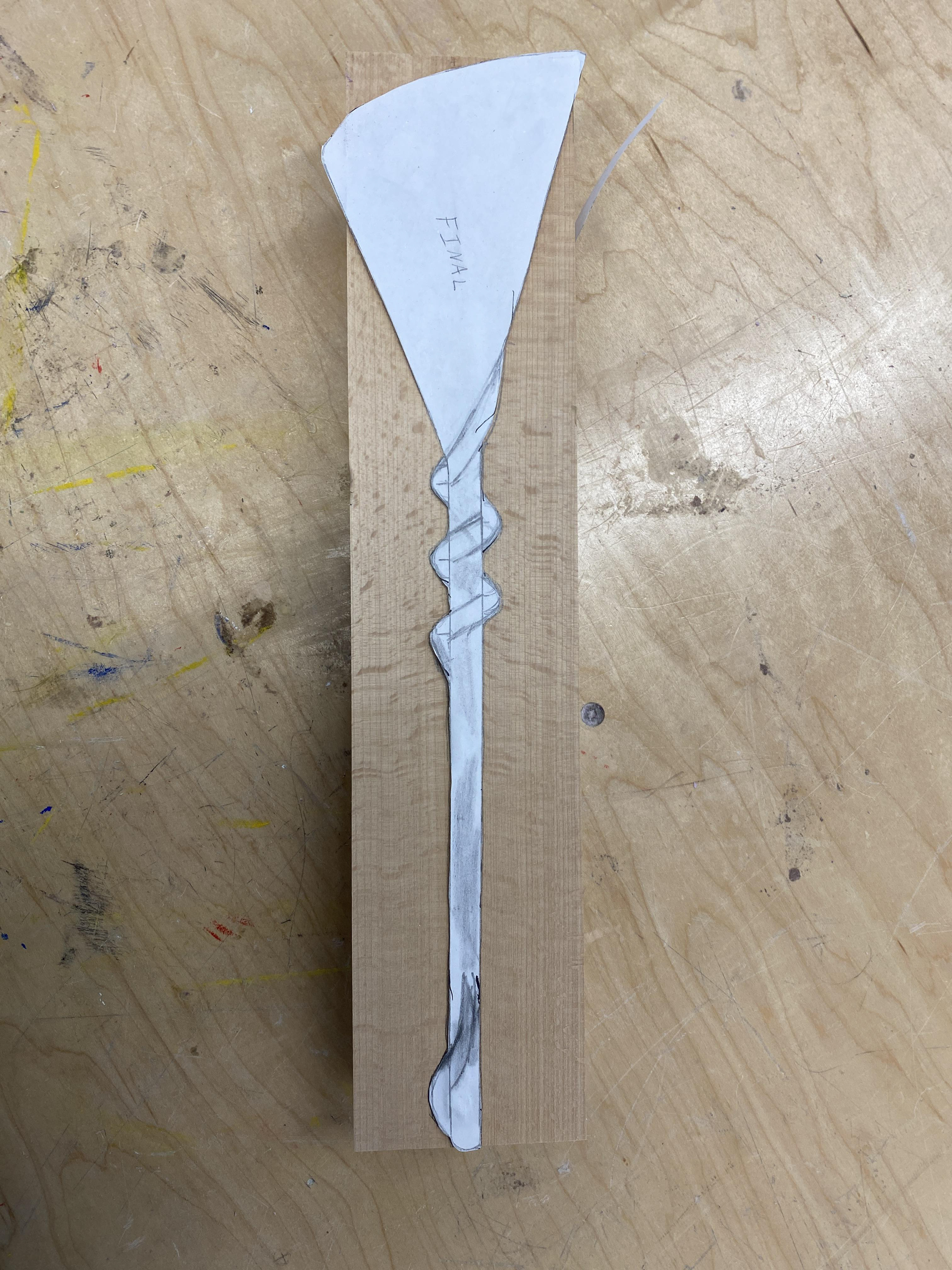 Created a pattern and then tested it by cutting it out on a band saw, taping it back together, then cutting out the side profile. Then I refined it and sanded the swirls down.