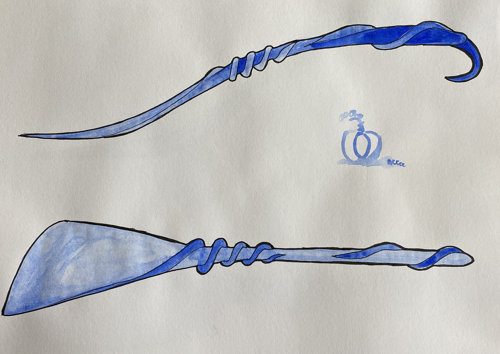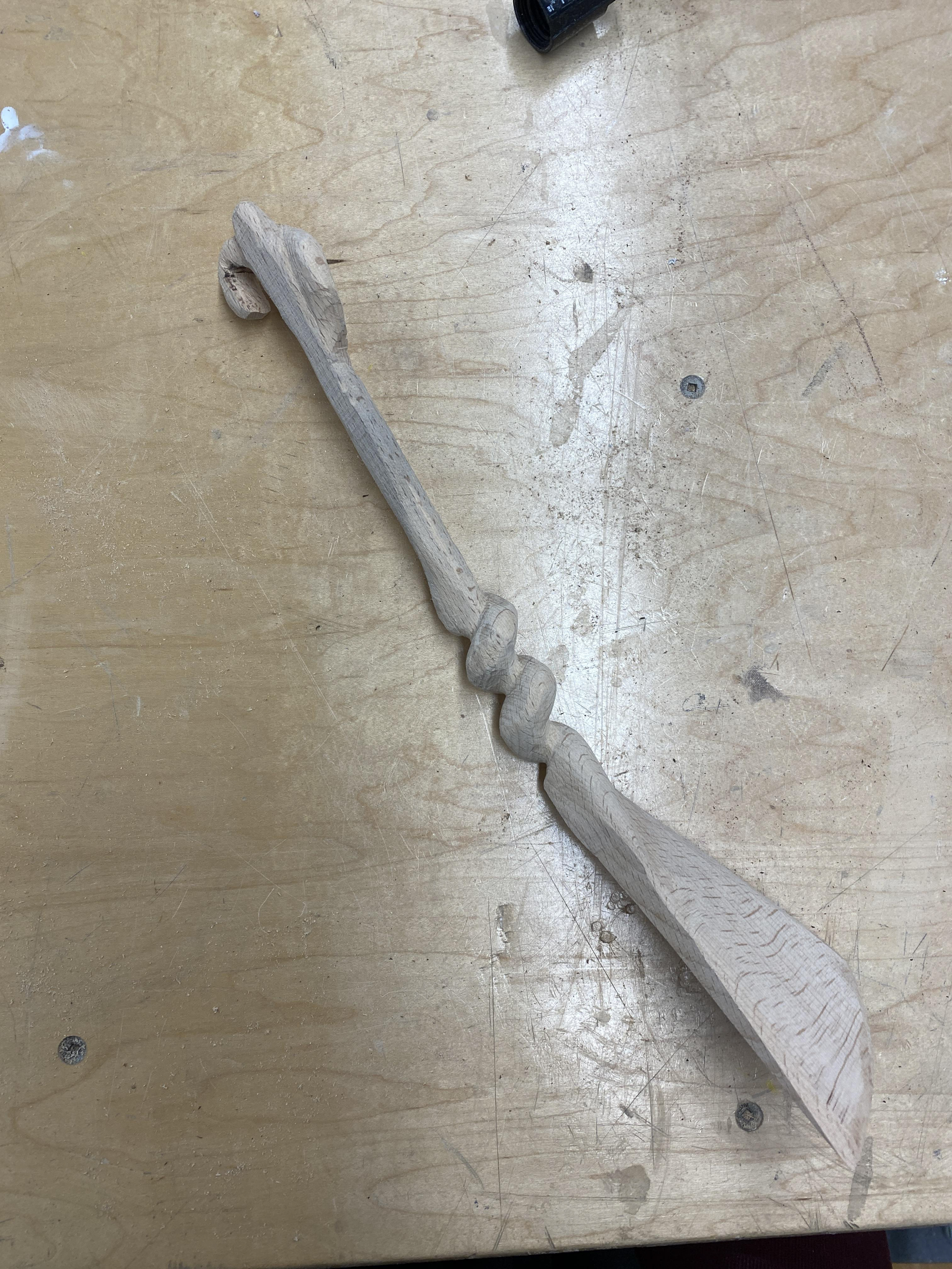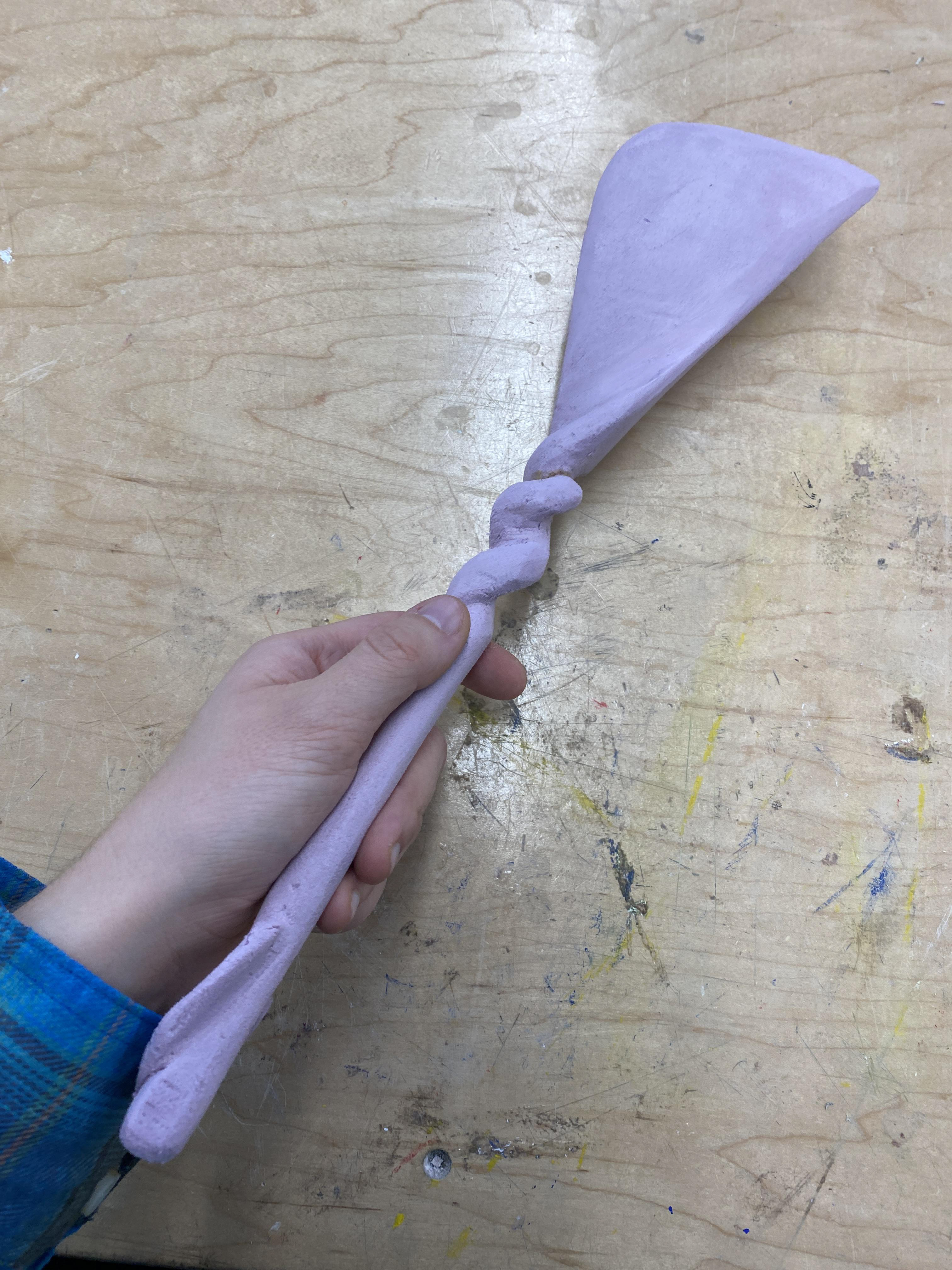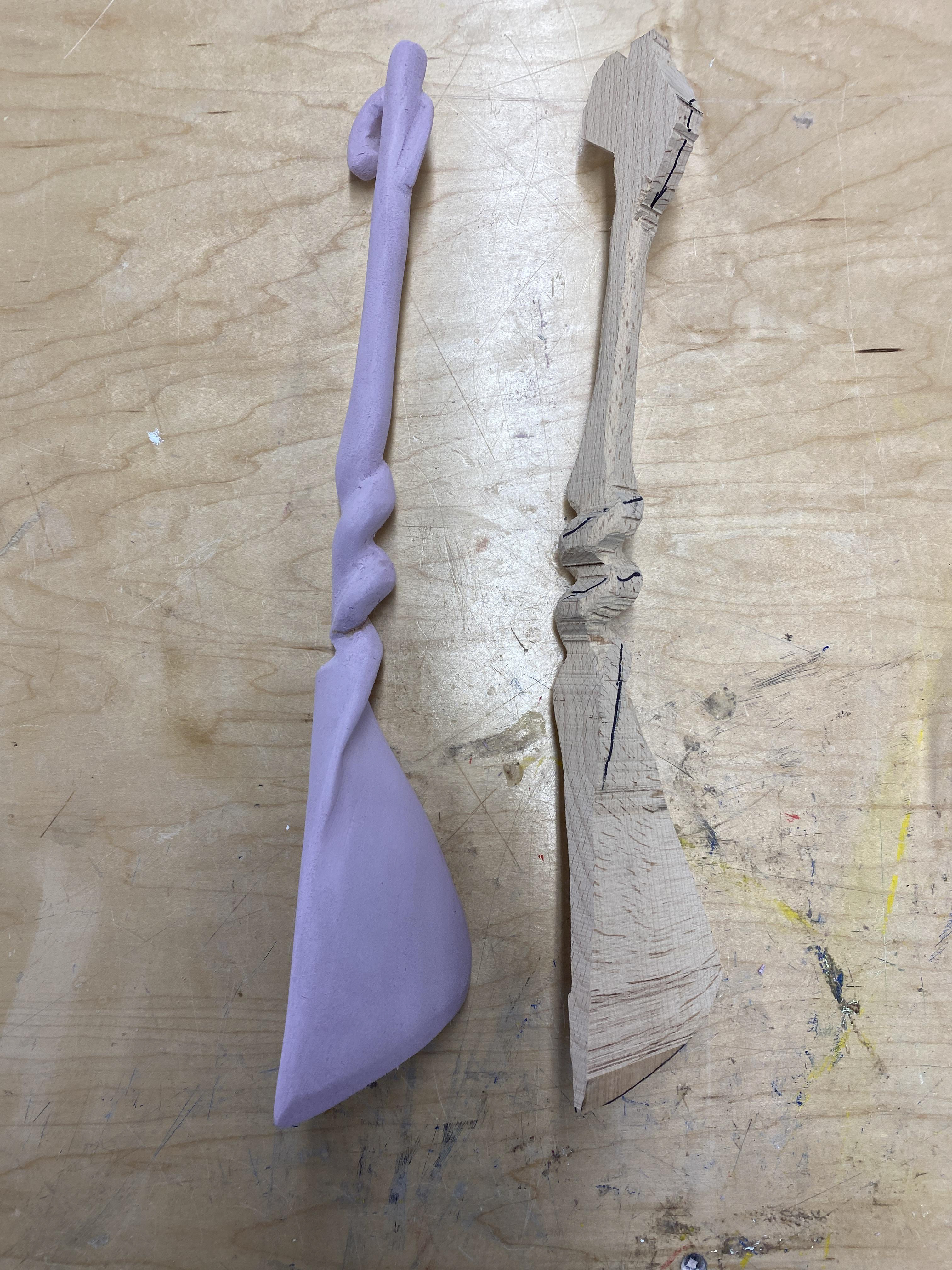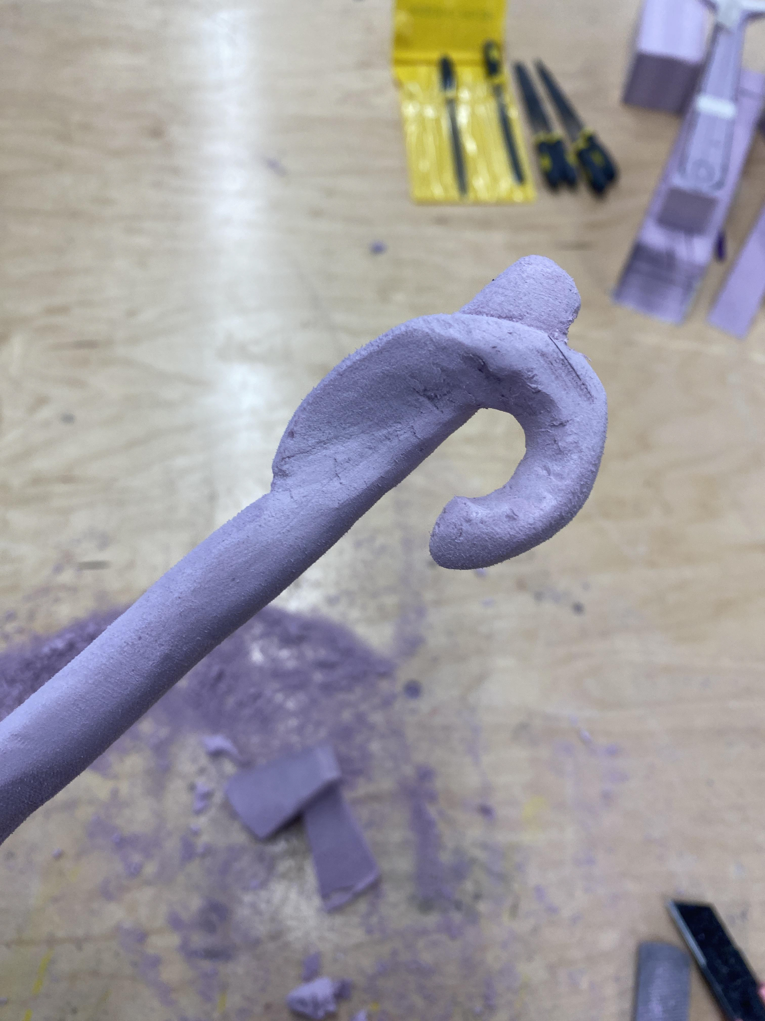 I knew I wanted to do something that emulated a wand. After deciding on the pumpkin vine spatula, I had to see if it would work- so I carved a model out of pink foam, using a rasp and sand paper.